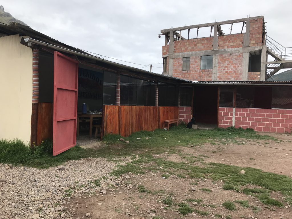↑休憩・朝食(軽食)場所につきました。見ればみるほど、怖くなる建物ですが笑。中に入るとテーブルがあり食事をしました。飾ってあったレインボーマウンテンの壁掛けと国旗たち↓
