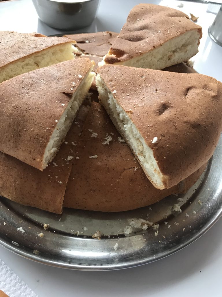 山に登るから食べるしかないですよね。朝7時に、朝食のパンとお茶です。